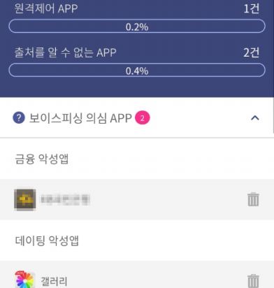 - 위험 앱이 발견되면 목록에 표시되며, 사용자에게 삭제 안내가 제공되고 직접 제거할 수 있습니다.