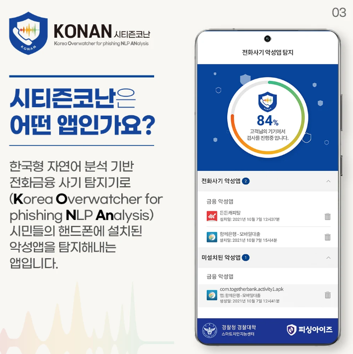 "시티즌 코난(Citizen Conan)"은 보이스피싱이나 스미싱과 같은 범죄를 사전에 차단하기 위해 경찰청이 개발한 안드로이드 전용 보안 앱입니다.