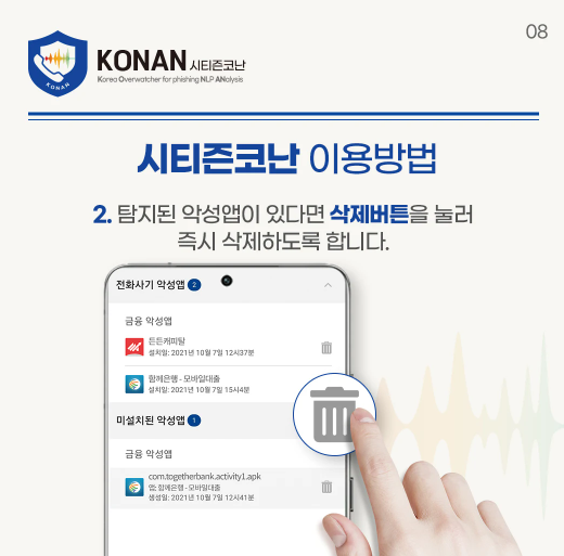 - 탐지된 악성 앱에 대해 즉각적으로 삭제 유도 및 경고 메시지를 제공하며, 보이스피싱 상황 발생 시 대출 지연이나 알림 전송 등의 적극적인 대응이 가능합니다.