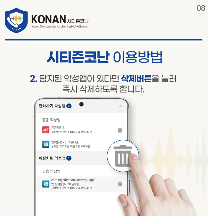 - 일부 금융기관과 연동된 기능을 통해, 보이스피싱이 의심되는 상황에서는 대출 실행을 지연시키거나 경고창을 띄워 피해를 예방합니다.