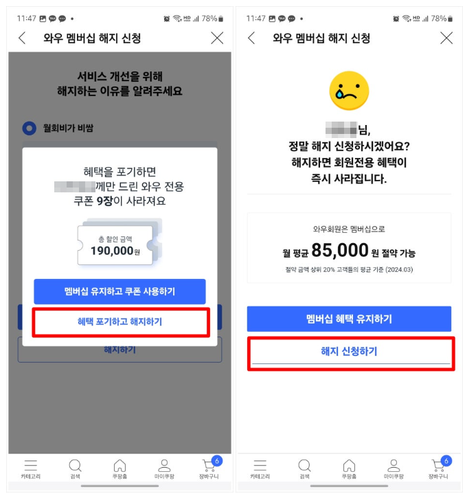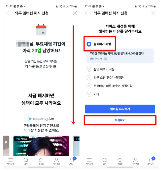 모바일에서 쿠팡 와우 멤버십 해지 방법