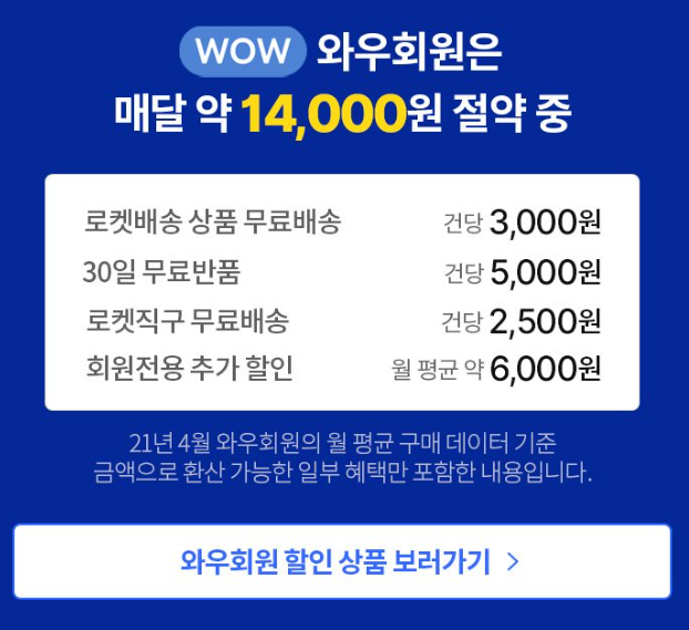 일반 회원의 경우 반품할 때 2,500원에서 많게는 5,000원까지 수수료를 부담해야 하지만, 와우 회원은 이와 같은 추가 비용을 내지 않아도 됩니다.