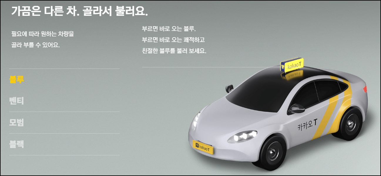- 블루: 카카오가 인증한 친절한 기사님이 운행하는 차량입니다.