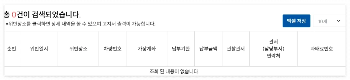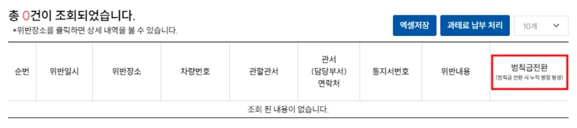 - 상단 메뉴에서 '과태료' 또는 '범칙금'을 선택하여 조회합니다.