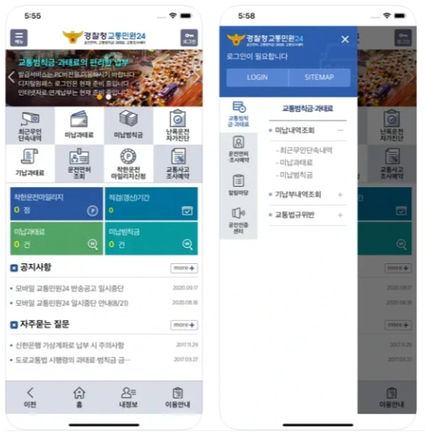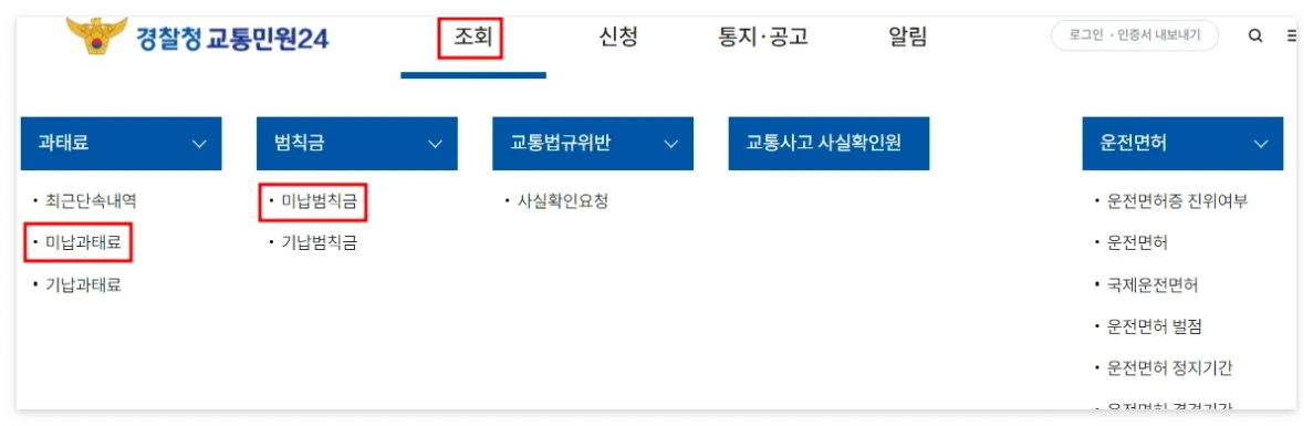 - 메인 메뉴에서 '교통범칙금/과태료 조회'를 선택하면 미납 내역과 부과 사유를 확인할 수 있습니다.