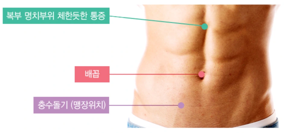 시간이 지나면서 통증은 배꼽 주변에서 시작해 점차 오른쪽 하복부로 이동하는 경우가 많습니다.