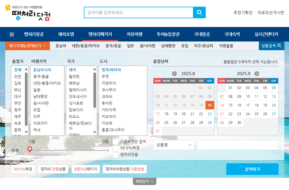 ‘땡처리닷컴’은 국내에서 가장 잘 알려진 특가 여행사 중 하나로, 항공권부터 호텔·에어텔·패키지·렌터카까지 폭넓은 상품을 제공합니다.
