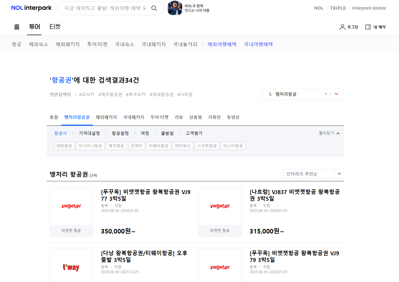 인터파크 투어는 날짜별 항공권 가격을 한눈에 확인할 수 있는 달력형 검색 기능이 장점입니다.