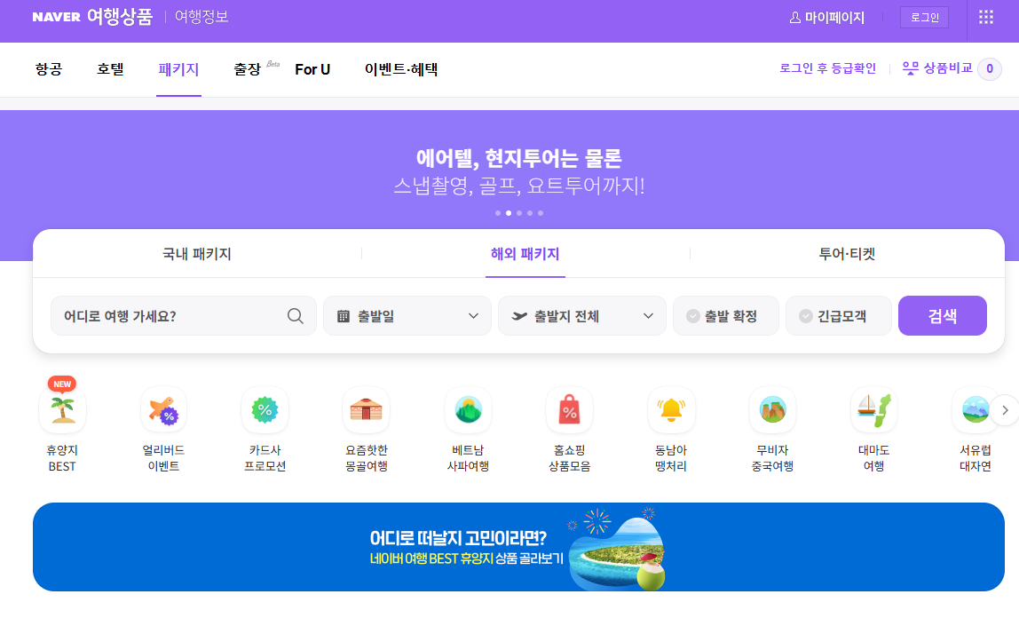 동남아, 일본, 유럽 등 다양한 해외 노선뿐 아니라 국내 패키지도 함께 확인할 수 있습니다.
