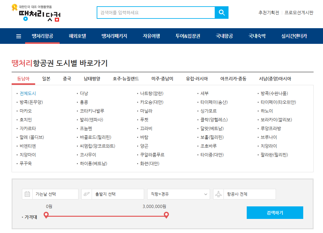 단순히 항공권뿐 아니라 갑작스럽게 기획된 저가 여행 패키지도 함께 판매하기 때문에 비교 검색에 유용합니다.