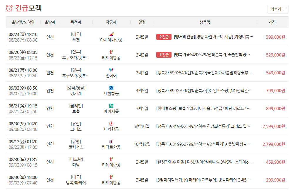 특히 출발 2주 전부터 빠르면 2~3일 전까지 남은 좌석을 활용한 급매 상품이 올라오기 때문에, 일정이 맞는다면 매우 저렴한 가격으로 해외여행을 다녀올 수 있습니다.