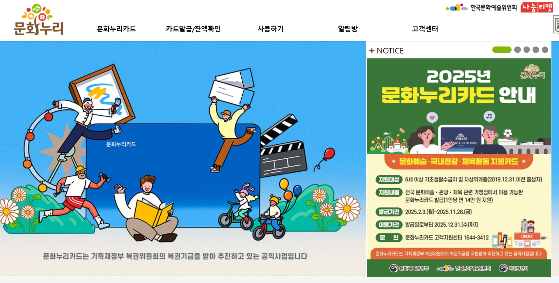 문화누리카드 전용 홈페이지(누리집)에서는 발급 신청, 잔액 확인, 가맹점 검색 등 카드 이용과 관련된 전 과정을 편리하게 처리할 수 있습니다.