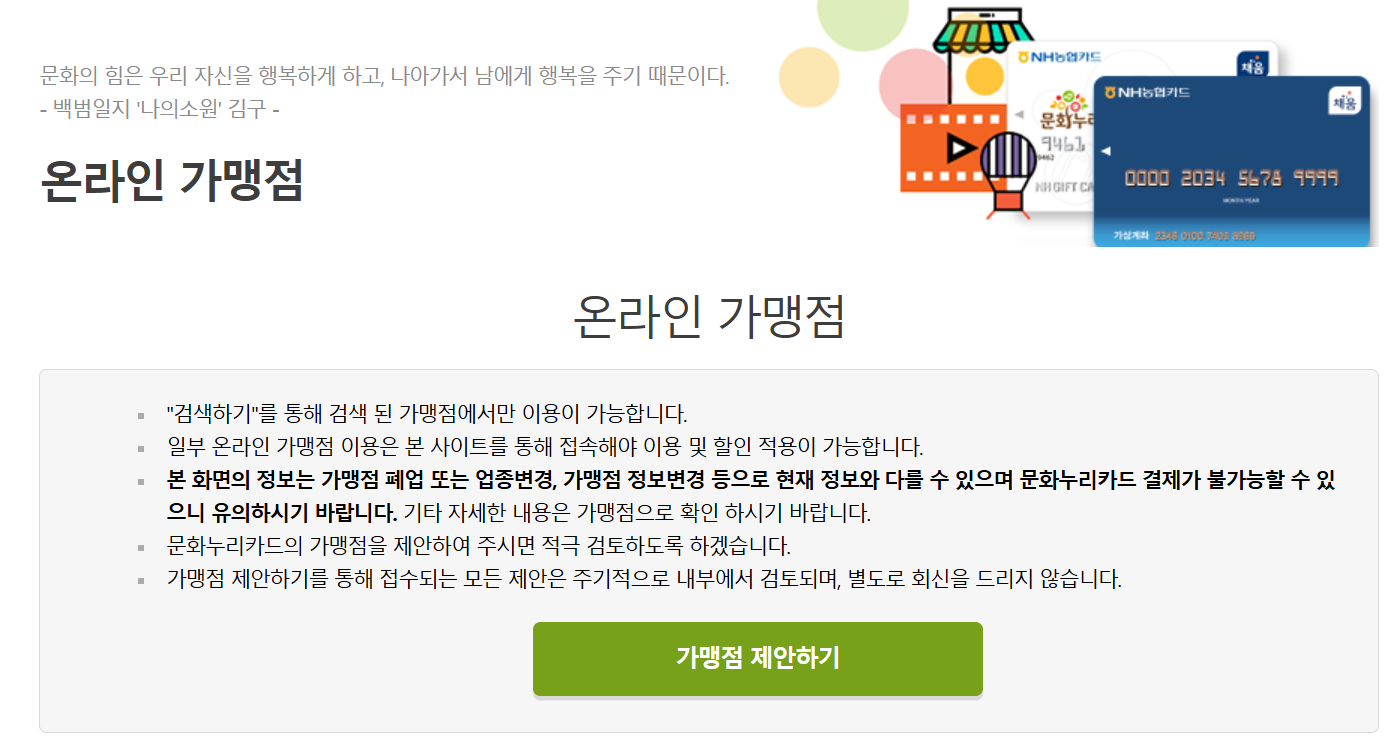 - 문화누리카드 홈페이지 또는 앱에서 오프라인 가맹점을 쉽게 검색할 수 있습니다.