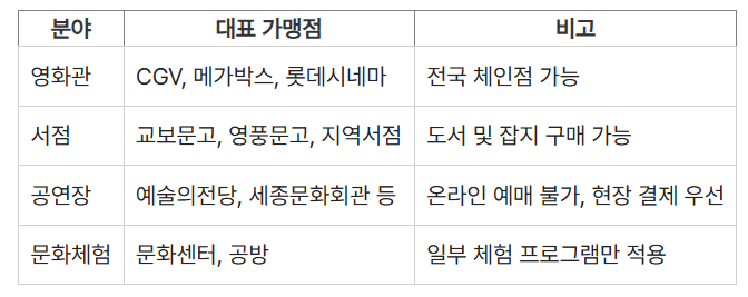 영화관에서 최신 영화를 관람하거나 서점에서 책을 구입하는 것은 물론, 전시회와 공연, 스포츠 경기 관람, 여행 등 다양한 영역에서 자유롭게 사용할 수 있습니다.
