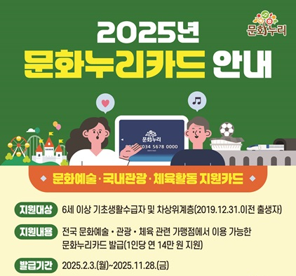 문화누리카드를 적극적으로 활용해 여가를 풍부하게 만들고, 생활 속에서 다양한 문화적 경험을 즐겨보시기 바랍니다.