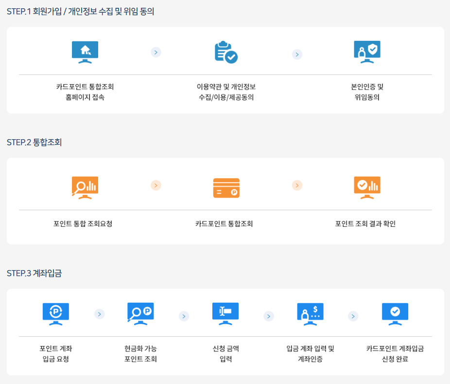 각 카드사 앱을 일일이 접속할 필요 없이, 통합 시스템에 접속하면 보유 중인 모든 카드포인트를 조회할 수 있으며, 현금 전환이 가능한 포인트는 즉시 본인 명의 계좌로 입금 신청을 할 수 있습니다.