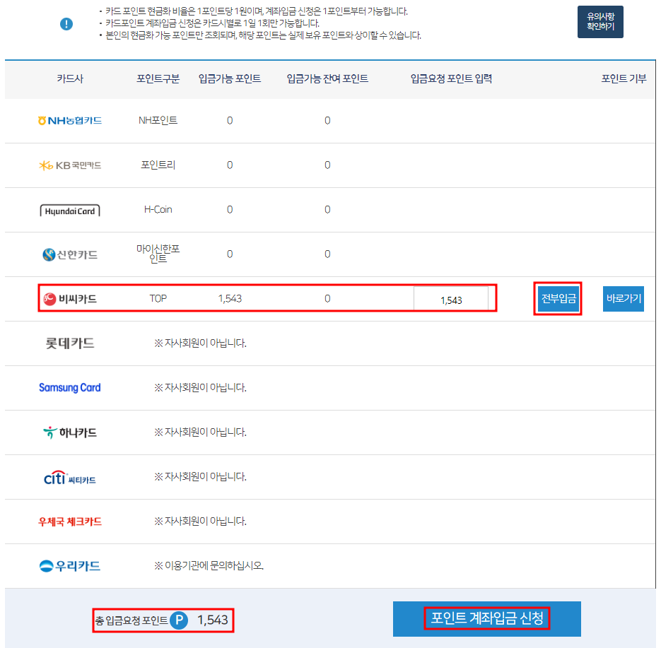 - 계좌입금 금액을 포인트로 다시 전환하려면 각 카드사에 개별 문의해야 합니다.