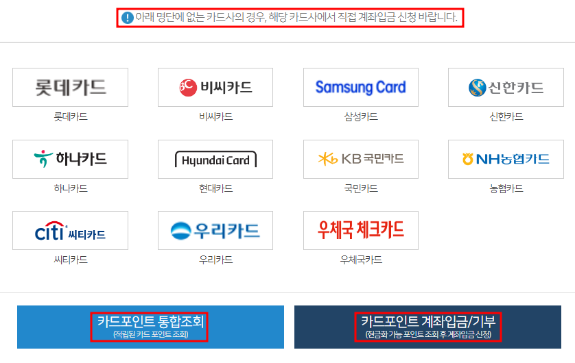 홈페이지에서 포인트 조회가 바로 가능한 카드사는 총 11개 카드사입니다. 아래 목록에 없는 카드사는 해당 카드사에 직접 계좌입금을 신청해야 합니다.